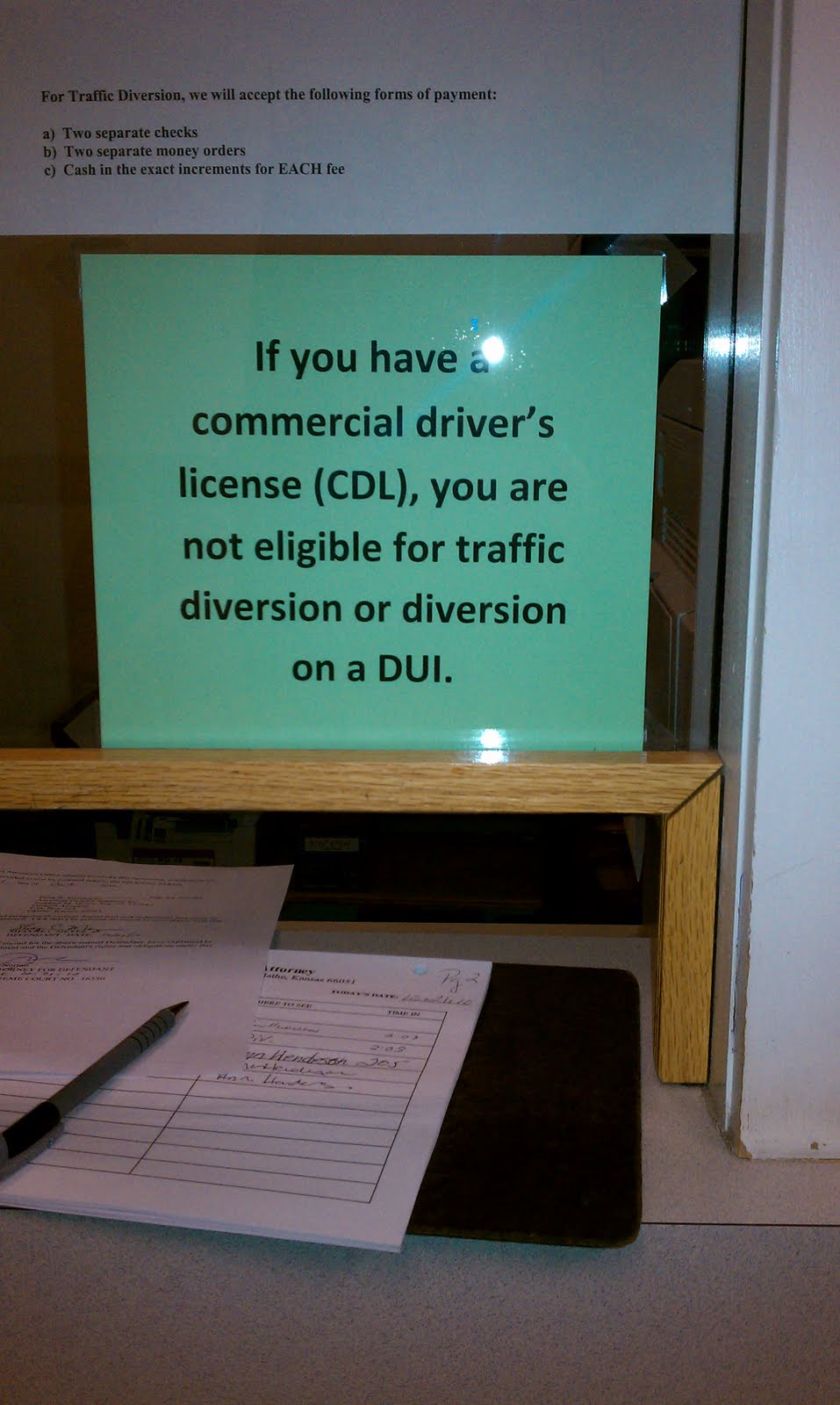 Second, a Kansas CDL holder is not eligible for diversion for a Kansas DUI. A federal law passed several years ago, and forced upon the states, requires that states prohibit CDL holders from “masking” any convictions for traffic offenses. A DUI diversion counts as a conviction in Kansas, so you would think that a diversion for a Kansas DUI would not run afoul of this federal law. However, when Phill Kline was the Kansas Attorney General briefly, he issued an opinion that diversion was a form of masking a DUI conviction and that CDL holders are not eligible for diversion in Kansas. Again, this applies even if the person was driving his or her personal vehicle or not. So, a CDL holder cannot get diversion for a DUI, or any other traffic offense. The photo above is one that I recently took with my phone while visiting the Johnson County District Attorney’s Office. Obviously, CDL’s are not getting diversion for the Kansas DUI cases. The stakes are higher for CDL holders in these cases and a person who has a CDL and gets arrested for a DUI needs the best Kansas DUI lawyer he or she can get in order to fight the case.